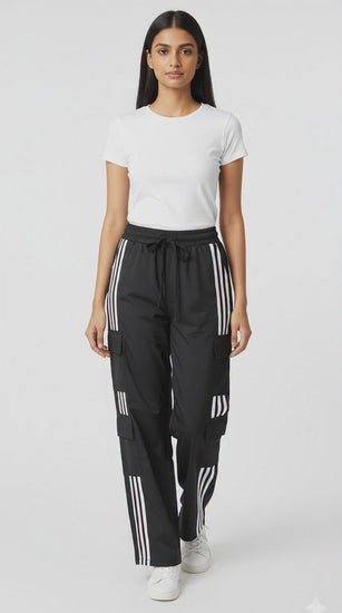 This Unisex Black Triple-Stripe Cargo Track Pant is made from premium lightweight polyester that is soft, breathable, and quick-drying, giving all-day comfort for any activity. It features a smooth fabric finish, sporty triple-stripe detailing, and multiple utility cargo pockets for a stylish yet functional look. The elastic waistband with an adjustable drawstring ensures a perfect and secure fit for both men and women. Designed with durable stitching, medium stretch, and a relaxed comfort fit, this track pant is ideal for daily wear, gym workouts, jogging, travel, college, and casual outings.